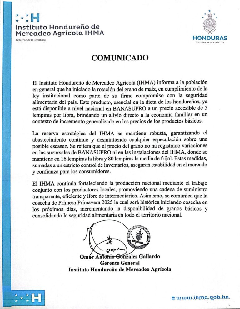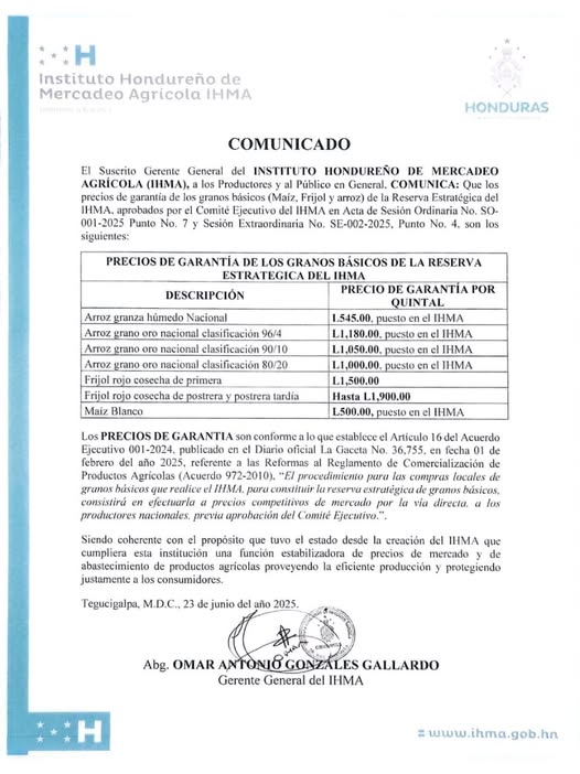 El Instituto Hondureño de Mercadeo Agrícola a las productoras, productores y público en general comunica que los PRECIOS DE GARANTIA para la compra de granos básicos de la reserva estratégica para el año 2025 serán los siguientes. ¡El IHMA ha…